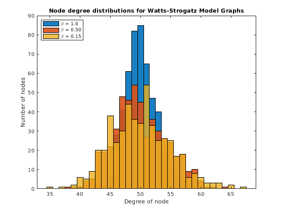 histogram(degree(h2),'BinMethod','integers','FaceAlpha',0.9); hold on histogram(degree(h3),'BinMethod','integers','FaceAlpha',0.9); histogram(degree(h4),'BinMethod','integers','FaceAlpha',0.8); hold off title('Node degree distributions for Watts-Strogatz Model Graphs') xlabel('Degree of node') ylabel('Number of nodes') legend('\beta = 1.0','\beta = 0.50','\beta = 0.15','Location','NorthWest')