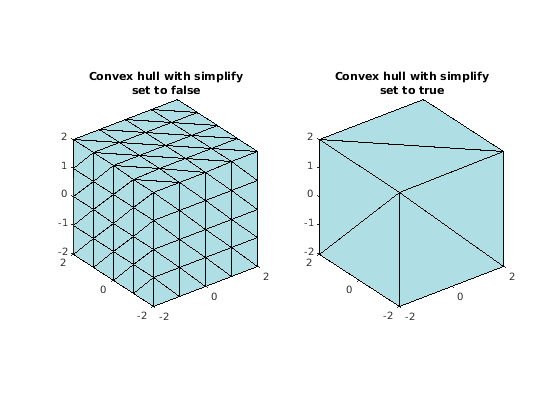 [x,y,z] = meshgrid(-2:1:2,-2:1:2,-2:1:2); x = x(:); y = y(:); z = z(:); K1 = convhull(x,y,z); subplot(1,2,1) defaultFaceColor = [0.6875 0.8750 0.8984]; trisurf(K1,x,y,z,'Facecolor',defaultFaceColor) axis equal title(sprintf('Convex hull with simplify\nset to false')) K2 = convhull(x,y,z,'simplify',true); subplot(1,2,2) trisurf(K2,x,y,z,'Facecolor',defaultFaceColor) axis equal title(sprintf('Convex hull with simplify\nset to true'))