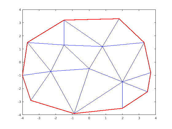 X = [-1.5 3.2; 1.8 3.3; -3.7 1.5; -1.5 1.3; 0.8 1.2; ... 3.3 1.5; -4.0 -1.0; -2.3 -0.7; 0 -0.5; 2.0 -1.5; ... 3.7 -0.8; -3.5 -2.9; -0.9 -3.9; 2.0 -3.5; 3.5 -2.25]; dt = delaunayTriangulation(X);