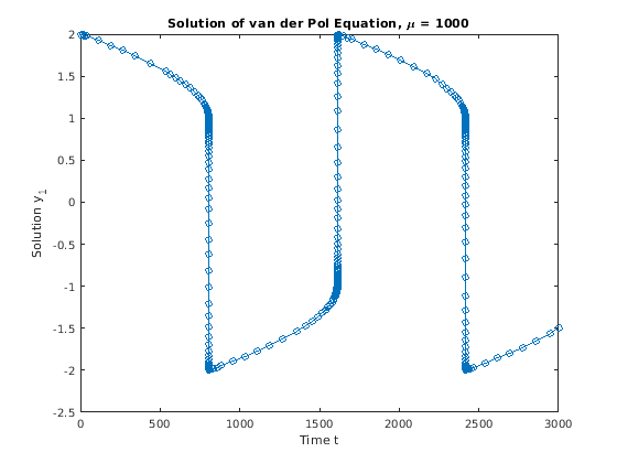 [t,y] = ode15s(@vdp1000,[0 3000],[2; 0]); plot(t,y(:,1),'-o'); title('Solution of van der Pol Equation, \mu = 1000'); xlabel('Time t'); ylabel('Solution y_1');