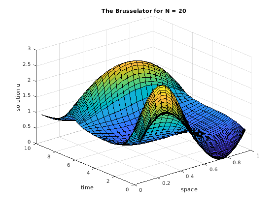 Классическая система уравнений Brusselator является потенциально большой, жесткой, и разреженной. Диффузия системных моделей Brusselator в химической реакции, и представлена включением системы уравнений