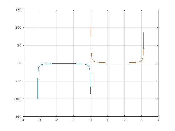 В арифметике с плавающей точкой csc является ограниченной функцией. Таким образом, csc не делает возвращаемых значений Inf или -Inf в точках развилки, которые являются множителями pi, но большим номером значения вместо этого. Это происходит от погрешности представления с плавающей точкой π.