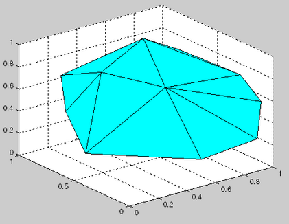 X = rand(25,3) dt = DelaunayTri(X) [ch v] = convexHull(dt) trisurf(ch, dt.X(:,1),dt.X(:,2),dt.X(:,3), 'FaceColor', 'cyan')