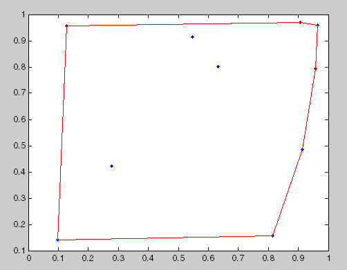 x = rand(10,1) y = rand(10,1) dt = DelaunayTri(x,y) k = convexHull(dt) plot(dt.X(:,1),dt.X(:,2), '.', 'markersize',10); hold on; plot(dt.X(k,1),dt.X(k,2), 'r'); hold off;