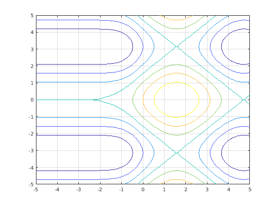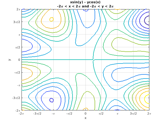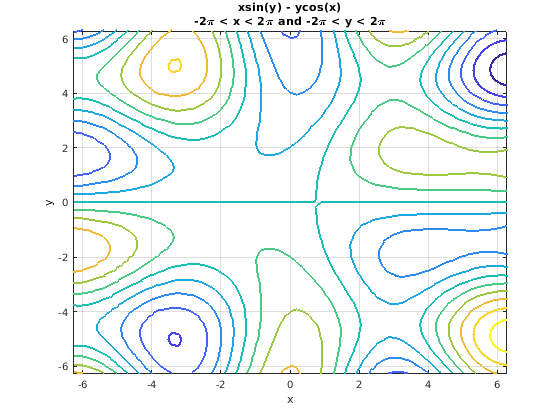 fcontour(@(x,y) x.*sin(y) - y.*cos(x), [-2*pi 2*pi], 'LineWidth', 2); grid on title({'xsin(y) - ycos(x)','-2\pi < x < 2\pi and -2\pi < y < 2\pi'}) xlabel('x') ylabel('y')