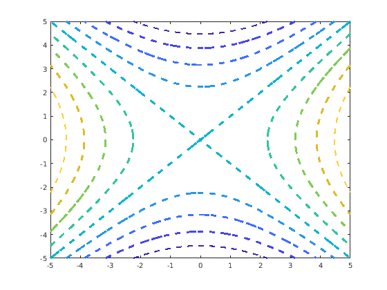 f = @(x,y) x.^2 - y.^2; fcontour(f,'--','LineWidth',2)