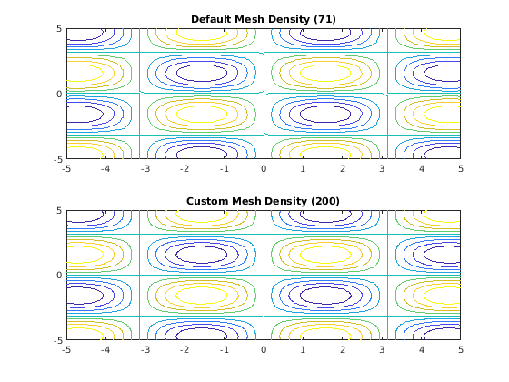 f = @(x,y) sin(x).*sin(y); subplot(2,1,1) fcontour(f) title('Default Mesh Density (71)') subplot(2,1,2) fcontour(f,'MeshDensity',200) title('Custom Mesh Density (200)')