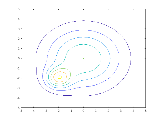f = @(x,y) exp(-(x/3).^2-(y/3).^2) + exp(-(x+2).^2-(y+2).^2); fc = fcontour(f)