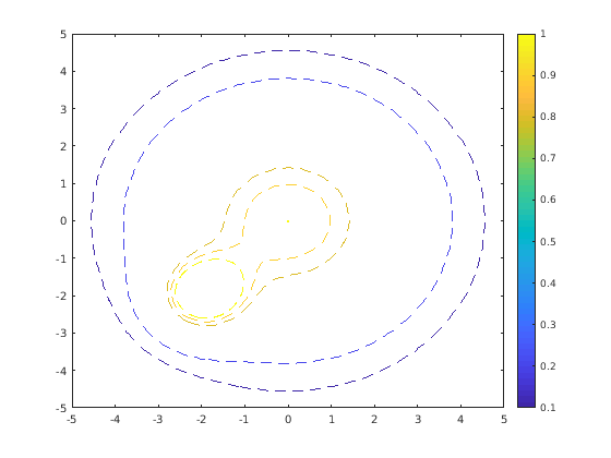 Измените ширину линии на 1 и стиль линии к пунктирной линии при помощи записи через точку, чтобы установить свойства функционального объекта контура. Покажите контуры близко к 0 и 1 путем установки свойства LevelList. Добавьте шкалу палитры.