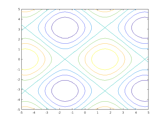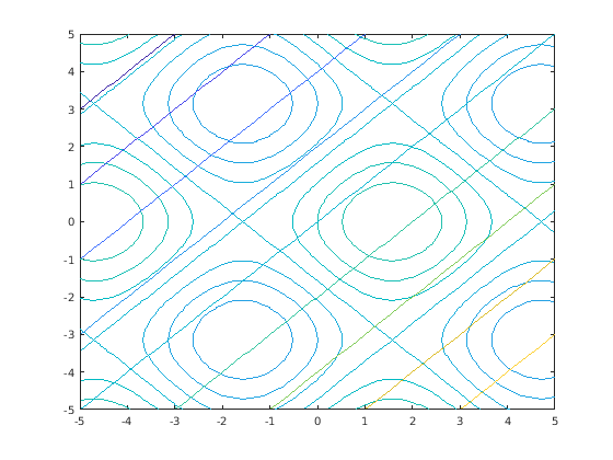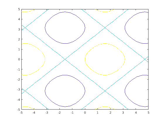 fcontour(@(x,y) sin(x)+cos(y)) hold on fcontour(@(x,y) x-y) hold off