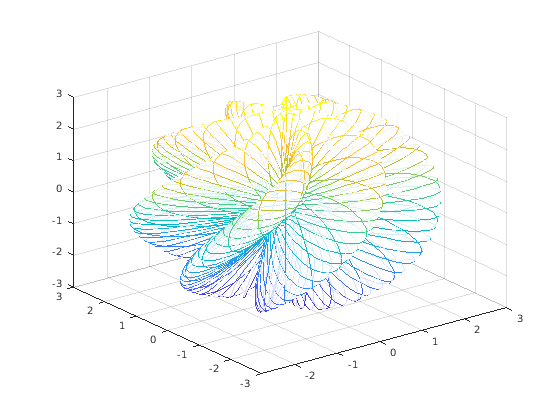 r = @(s,t) 2 + sin(7.*s + 5.*t); x = @(s,t) r(s,t).*cos(s).*sin(t); y = @(s,t) r(s,t).*sin(s).*sin(t); z = @(s,t) r(s,t).*cos(t); fmesh(x,y,z,[0 2*pi 0 pi])