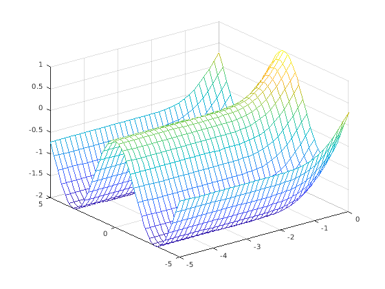 fmesh(@(x,y) erf(x)+cos(y),[-5 0 -5 5]) hold on fmesh(@(x,y) sin(x)+cos(y),[0 5 -5 5]) hold off
