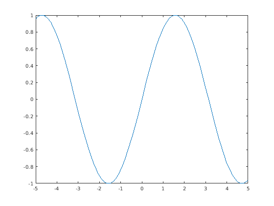 fplot(___)fplot( строит кривую, заданную функциональным f)y = f(x) на интервале по умолчанию [-5 5] для x.