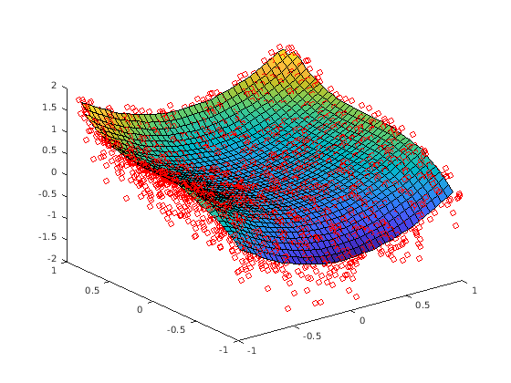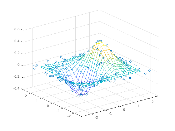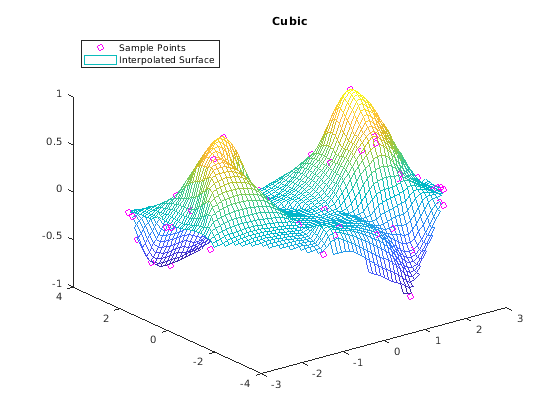 vq = griddata(x,y,v,xq,yq)vq = griddata(x,y,z,v,xq,yq,zq)vq = griddata(___,method) соответствует поверхности формы v = f (x, y) к данным, имеющий разброс в векторах vq = griddata(x,y,v,xq,yq)(x,y,v). Функция griddata интерполирует поверхность в точках запроса, заданных (xq,yq), и возвращает интерполированные значения, vq. Поверхность всегда точки проходов через данные, заданные x и y.
