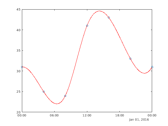 V = interp1(WeatherData.Time, WeatherData.Temperature, xq, 'spline');Постройте интерполированные точки.