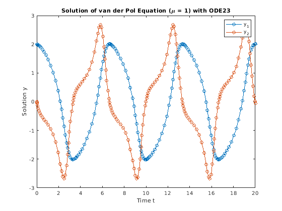 ode23(odefun,tspan,y0)tspan = [t0 tf], интегрирует систему дифференциальных уравнений от t0 до tf с начальными условиями y0. Каждая строка в массиве решения y соответствует значению, возвращенному в вектор-столбце t.