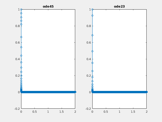 ode23(odefun,tspan,y0,options)options, который является созданным использованием аргумента функции odeset. Например, используйте AbsTol и опции RelTol, чтобы задать допуски абсолютной и относительной погрешности или опцию Mass, чтобы обеспечить большую матрицу.