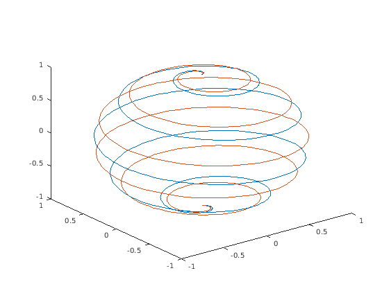 t = 0:pi/500:pi; xt1 = sin(t).*cos(10*t); yt1 = sin(t).*sin(10*t); zt1 = cos(t); xt2 = sin(t).*cos(12*t); yt2 = sin(t).*sin(12*t); zt2 = cos(t);