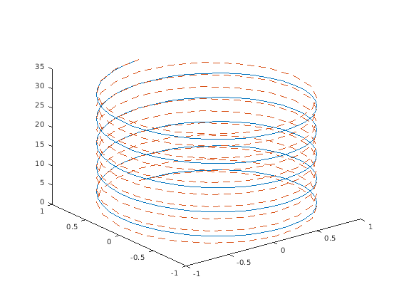 plot3(xt1,yt1,t,xt2,yt2,t,'--')