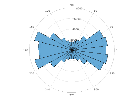 polarhistogram(___, задает дополнительные опции с помощью одного или нескольких аргументов пары "имя-значение". Например, можно использовать полупрозрачные панели путем определения Name,Value)'FaceAlpha' и скалярного значения между 0 и 1.