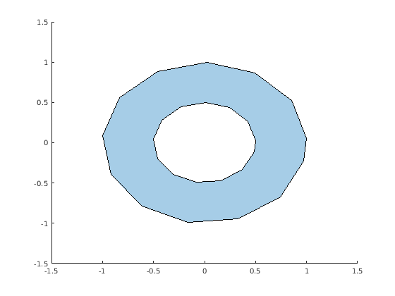 pgon = polyshape( создает P)polyshape из 2D вершин, заданных в N-by-2 матричный P, где N является количеством вершин. Первый столбец P задает x - координаты, и второй столбец задает y - координаты.