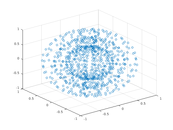figure [X,Y,Z] = sphere(16); x = [0.5*X(:); 0.75*X(:); X(:)]; y = [0.5*Y(:); 0.75*Y(:); Y(:)]; z = [0.5*Z(:); 0.75*Z(:); Z(:)]; scatter3(x,y,z)