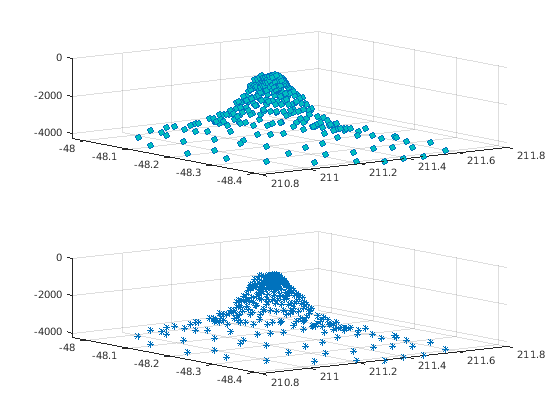 figure hs(1) = subplot(2,1,1); hs(2) = subplot(2,1,2); scatter3(hs(1),x,y,z,'MarkerFaceColor',[0 .75 .75]) scatter3(hs(2),x,y,z,'*')