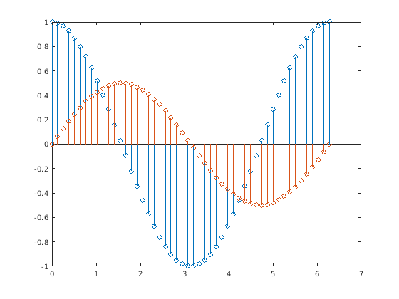 figure x1 = linspace(0,2*pi,50)'; x2 = linspace(pi,3*pi,50)'; X = [x1, x2]; Y = [cos(x1), 0.5*sin(x2)]; stem(X,Y)