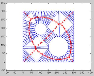 cc = circumcenters(trep); triplot(trep); axis([-50 350 -50 350]); axis equal; hold on; plot(cc(:,1),cc(:,2),'*r'); hold off;