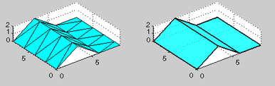 z = [0 0 0 0 0 2 2 2 2 2 2 0 0 0 0 0 0 0 0 0 0 0]'; subplot(1,2,1); trisurf(tri,x,y,z, 'FaceColor', 'cyan'); axis equal; % TRISURF display of surface mesh % showing mesh edges