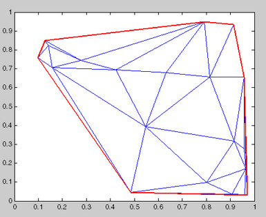 x = rand(20,1); y = rand(20,1); dt = DelaunayTri(x,y); fe = freeBoundary(dt)'; triplot(dt); hold on;