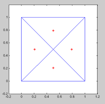 x = [0 1 1 0 0.5]'; y = [0 0 1 1 0.5]'; dt = DelaunayTri(x,y);