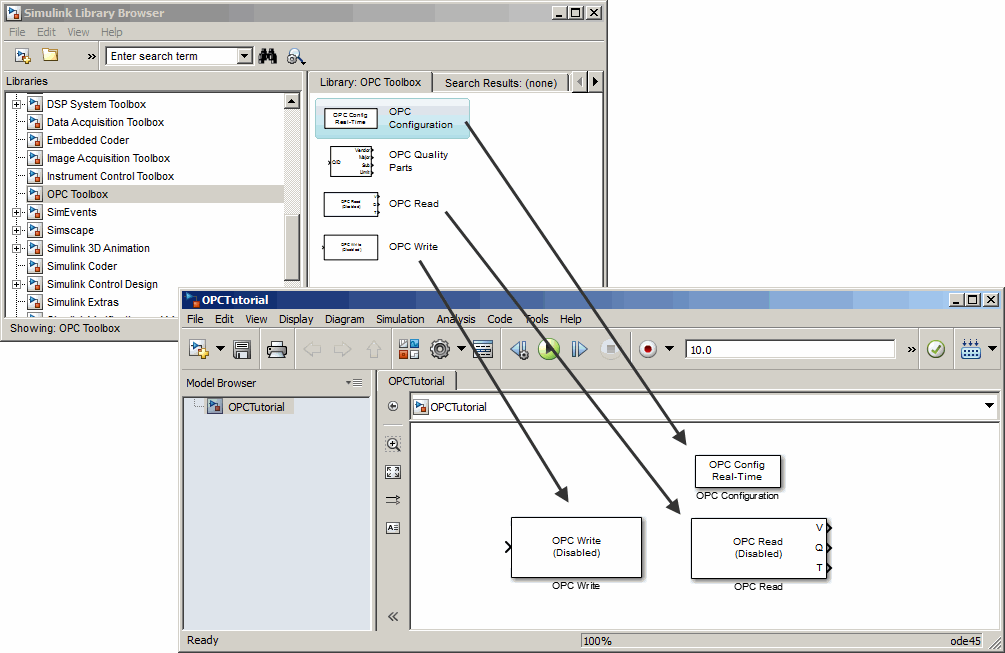 Можно использовать эти блоки, чтобы сконфигурировать и справиться со связями с серверами, отправить и получить живые данные между Сервером OPC и симуляцией, и анализировать качество OPC.