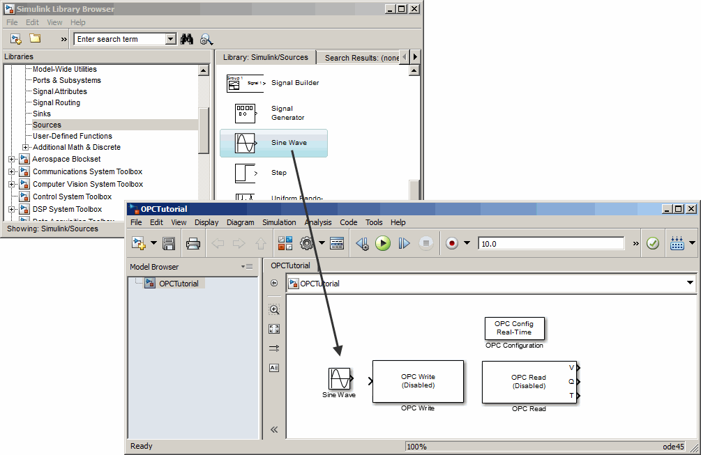 Чтобы отправить синусоиду в сервер, можно использовать блок Sine Wave. Чтобы получить доступ к блоку Sine Wave, расширьте узел Simulink в дереве браузера и кликните по записи библиотеки Sources. От блоков, отображенных на правой панели, перетащите блок Sine Wave в Редактор Simulink и поместите его слева от блока OPC Write.