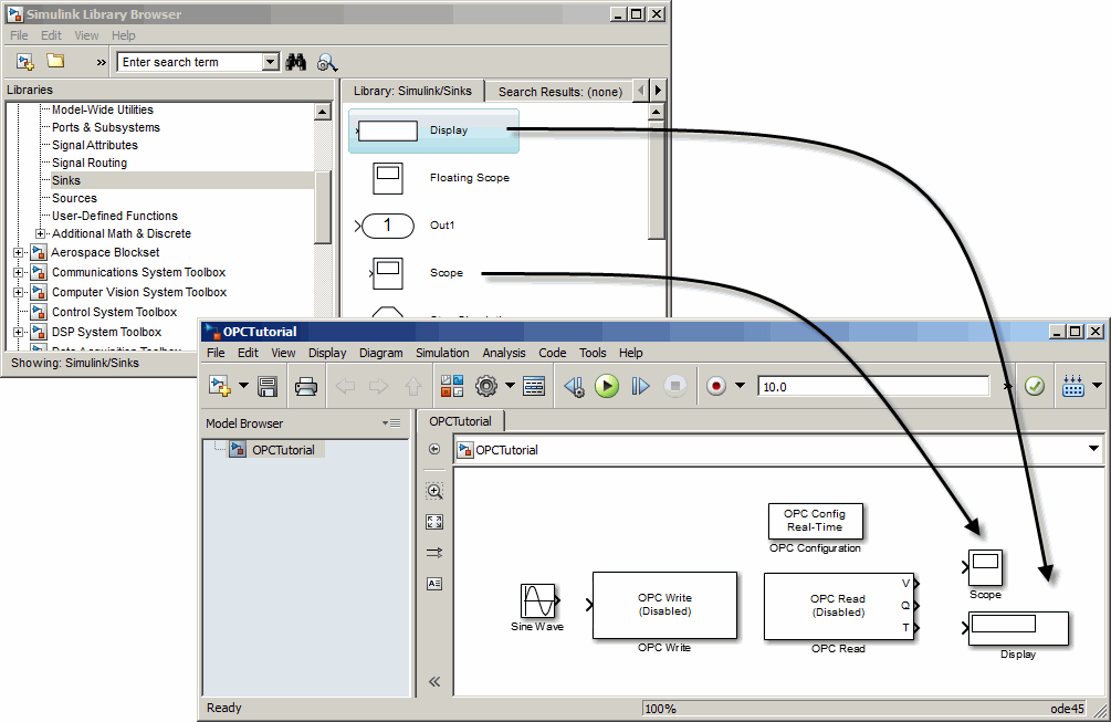 Можно использовать блок Scope, чтобы показать значение, полученное от сервера и блока Display, чтобы просмотреть качество элемента. (Вы удалите выходной порт метки времени на следующем шаге.), Чтобы получить доступ к блоку Scope, кликните по записи библиотеки Sinks в расширенном узле Simulink в дереве браузера. От блоков, отображенных на правой панели, перетащите блок Scope в Редактор Simulink и поместите его выше и справа от блока OPC Read. Также перетащите блок Display в Редактор Simulink и поместите его ниже блока Scope.