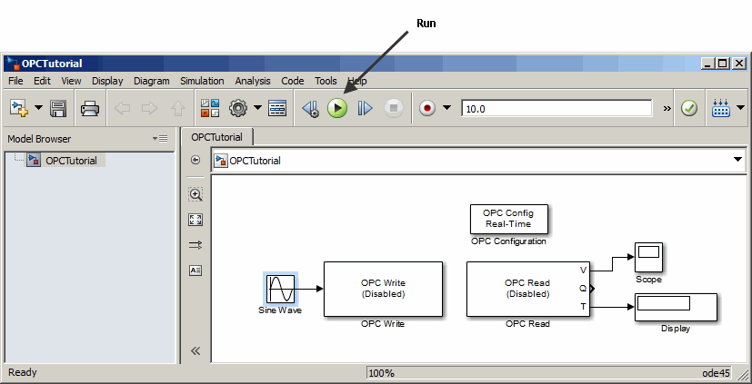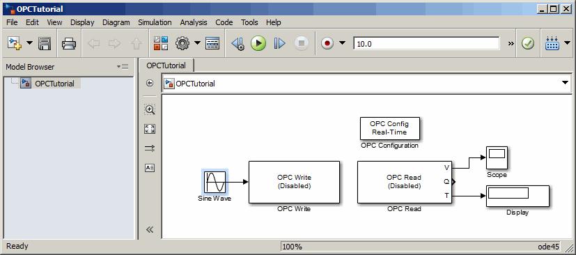 Обратите внимание на то, что Запись OPC и блоки Чтения OPC непосредственно не соединяются вместе в модели. Единственная связь между ними через элемент на сервере, который вы задали на Шаге 5: Сконфигурируйте Серверы OPC для Модели.