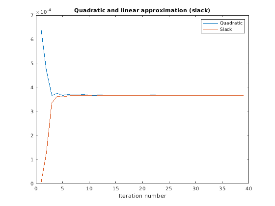 plot(history) legend('Quadratic','Slack') xlabel('Iteration number') title('Quadratic and linear approximation (slack)')