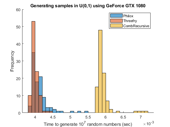 % Plot the results figure hold on histogram(gputimesU(:,1),"BinWidth",1e-4); histogram(gputimesU(:,2),"BinWidth",1e-4); histogram(gputimesU(:,3),"BinWidth",1e-4) legend(generators) xlabel("Time to generate 10^7 random numbers (sec)") ylabel("Frequency") title("Generating samples in U(0,1) using " + d.Name) hold off