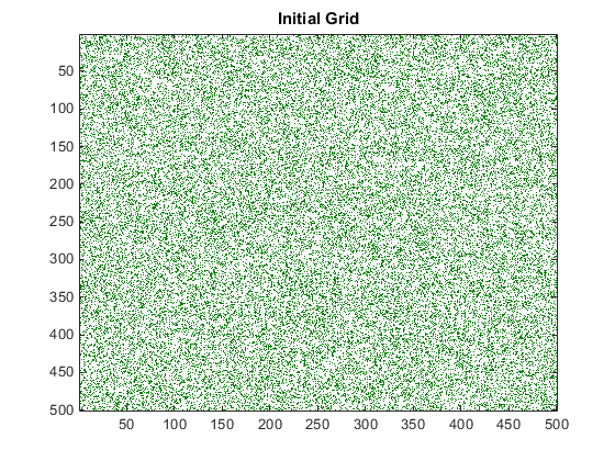 gridSize = 500; numGenerations = 100; initialGrid = (rand(gridSize,gridSize) > .75); gpu = gpuDevice(); % Draw the initial grid hold off imagesc(initialGrid); colormap([1 1 1;0 0.5 0]); title('Initial Grid');