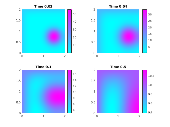 Объект TimeDependentResults содержит решение и его градиент, вычисленный в узлах треугольной или четырехгранной mesh, сгенерированной generateMesh.