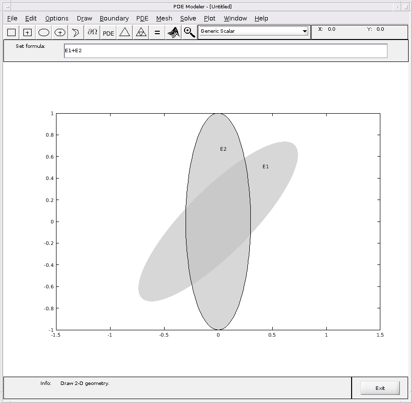 pdeellip(xc,yc,a,b,phi)pdeellip(xc,yc,a,b,phi,label)pdeellip( чертит эллипс с центром в (xc,yc,a,b,phi)xc, yc), полуоси a и b и вращение phi (в радианах). Команда pdeellip открывает приложение PDE Modeler с заданным эллипсом, чертившим в нем. Если приложение уже открыто, pdeellip добавляет заданный эллипс в окно приложения, не удаляя существующих форм.