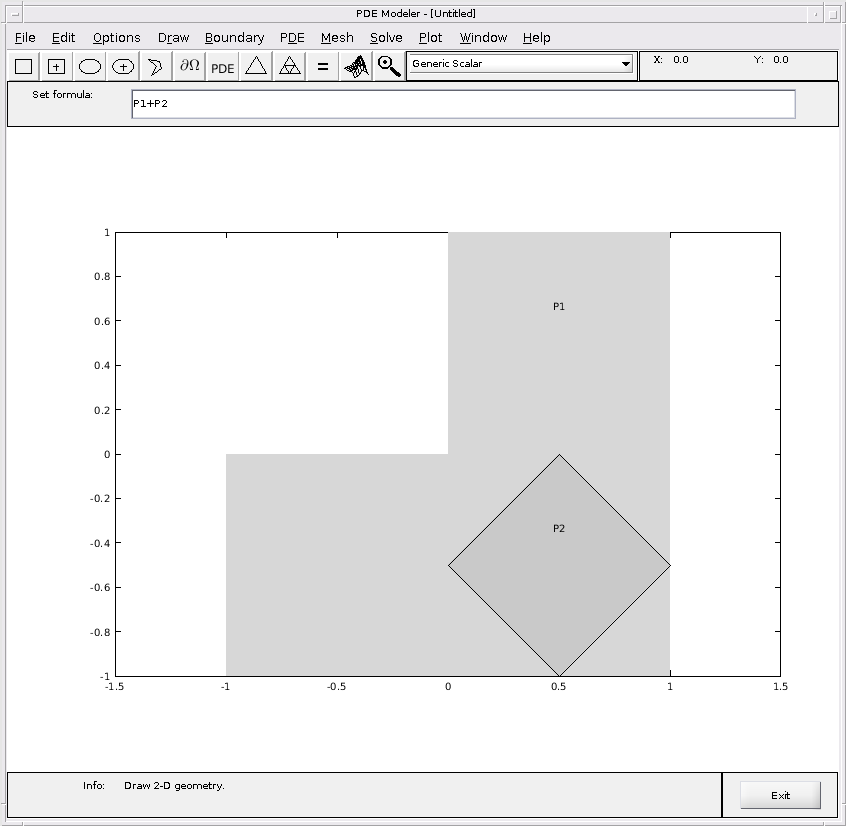 pdepoly(X,Y)pdepoly(X,Y,label)pdepoly( чертит полигон с угловыми координатами (вершины), заданные X,Y)X и Y. Команда pdepoly открывает приложение PDE Modeler с заданным полигоном, чертившим в нем. Если приложение уже открыто, pdepoly добавляет заданный полигон в окно приложения, не удаляя существующих форм.