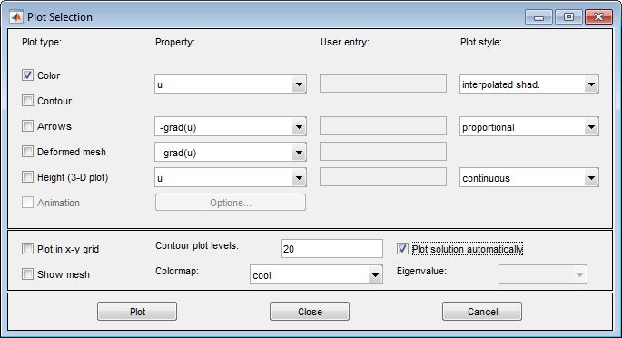 Если вы нажимаете кнопку Plot, решение сразу построено с помощью текущей настройки графика. Если нет никакого текущего доступного решения, УЧП сначала решен. Новое решение затем построено. Диалоговое окно остается на экране.