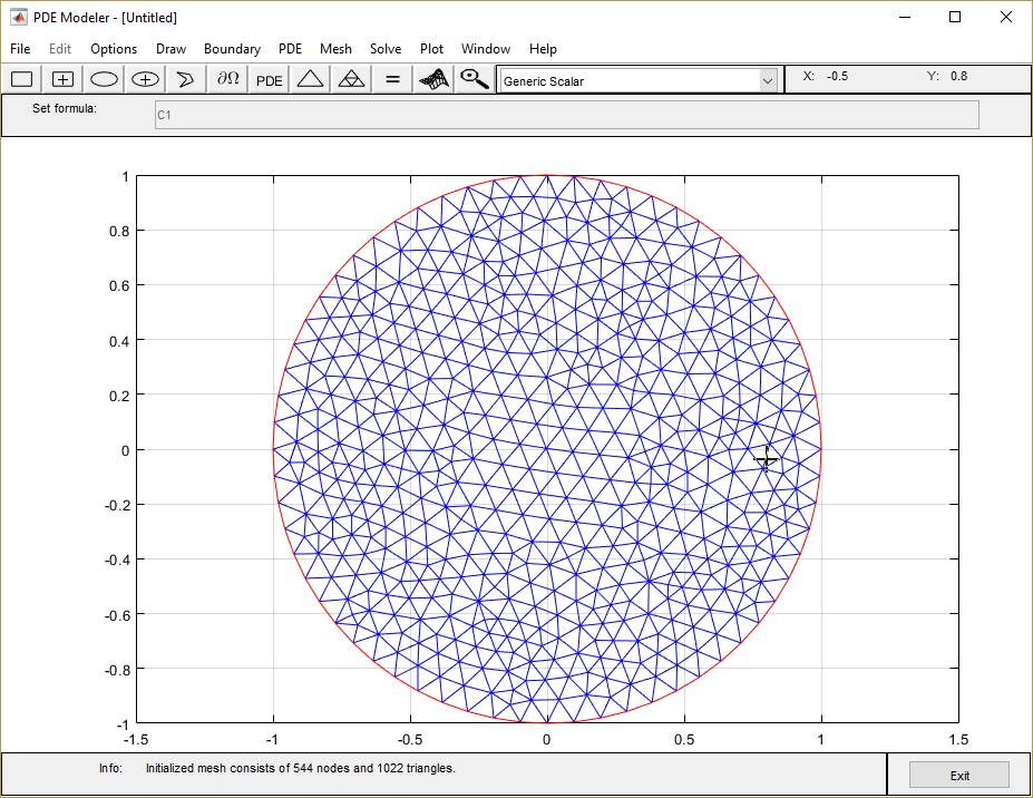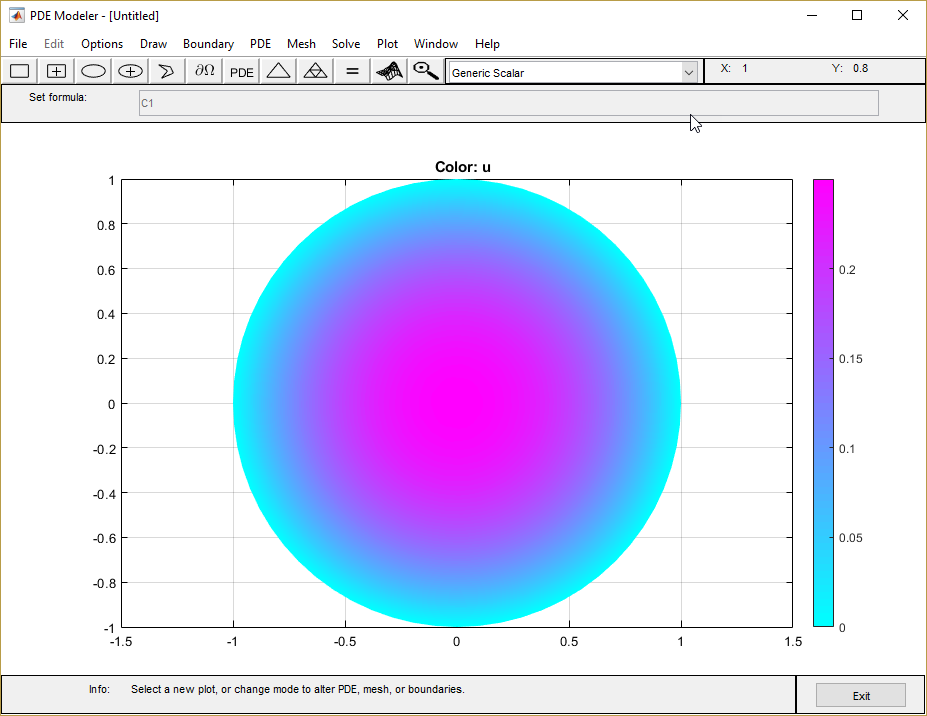 Этот пример использует приложение PDE Modeler. Для программируемого рабочего процесса смотрите уравнение Пуассона на Единичном диске. Поскольку приложение и программируемый рабочий процесс используют различный meshers, они приводят к немного отличающимся результатам.