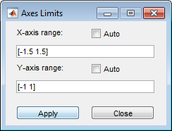 Задайте область значений x - оси и y - ось как 1 2 вектор, такой как [-10 10]. Если вы выбираете Auto, приложение использует автоматическое масштабирование для соответствующей оси.