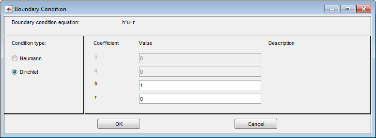 Дирихле обусловливает: u задан на контуре. Уравнением граничного условия является hu = r, где h является весовым коэффициентом, который может быть применен (обычно 1).
