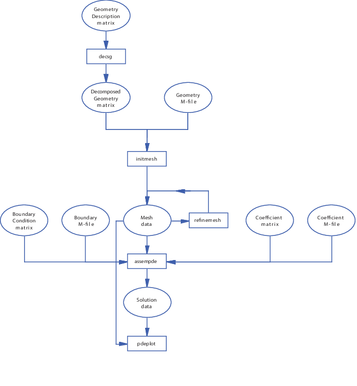 Анализируемая геометрия задана или Анализируемой матрицей Геометрии, или файлом Геометрии. Здесь, геометрия описана как набор непересекающихся минимальных областей, ограниченных граничными сегментами и сегментами границы. Анализируемая матрица Геометрии может быть создана из модели CSG при помощи функционального decsg. Это может также быть экспортировано из приложения PDE Modeler путем выбора опции Export Decomposed Geometry, Boundary Cond's из меню Boundary. Файл Геометрии, эквивалентный данной Анализируемой матрице Геометрии, может быть создан с помощью функции wgeom. Анализируемая геометрия может визуализироваться с функцией pdegplot. Для описаний структур данных Анализируемой матрицы Геометрии и файла Геометрии, смотрите страницу с описанием для decsg и Геометрии.
