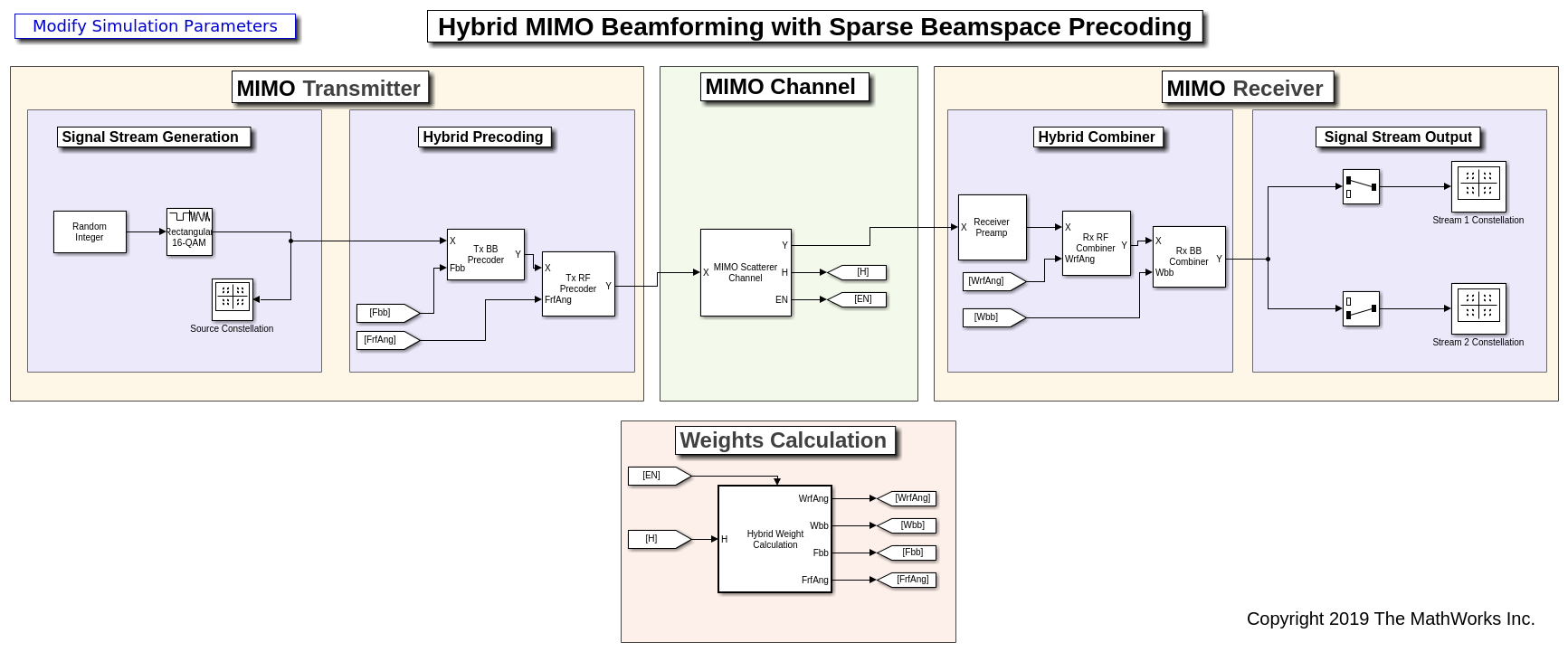 Этот пример предоставляет модель Simulink двух гибридов beamforming методы, QSHB и HBPS. Канал рассеивания MIMO используется, чтобы предоставить реалистическую модель канала для крупных систем MIMO. Модель Simulink разделена согласно функциям в потоке сигналов, который дает указания для аппаратной реализации. Для данного H количество символов может отличаться, чтобы моделировать переменную когерентную длину канала. С этой моделью Simulink могут быть изучены различные системные параметры и новый гибрид beamforming алгоритмы. Структура системы упрощает аппаратную реализацию.