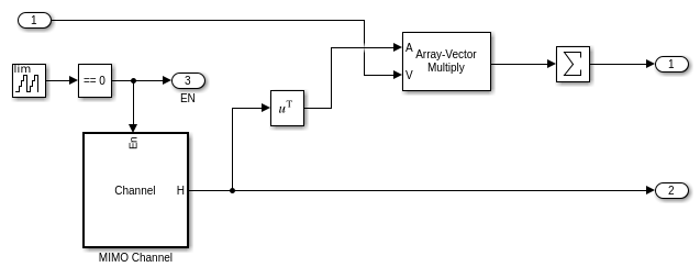 Канал рассеивания MIMO представлен матрицей канала. Кроме того, этот пример использует активированную подсистему, чтобы периодически изменить эту матрицу, чтобы моделировать то, что канал MIMO может отличаться в зависимости от времени.