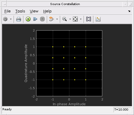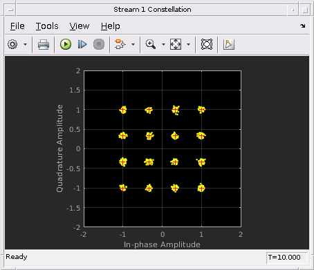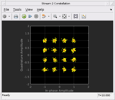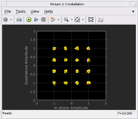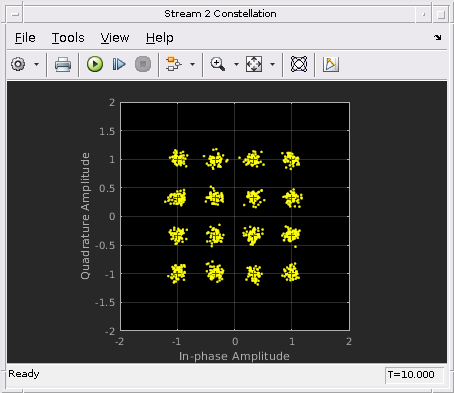 Следующие данные показывают восстановленные 16 потоков символа QAM в получателе с помощью алгоритмов QSHB. Получившаяся совокупность показывает это по сравнению с исходной совокупностью, восстановленные символы, правильно расположенные в обоих потоках. Это означает, что с помощью гибрида beamforming метод, мы можем улучшить системную способность путем отправки этих двух потоков одновременно. Кроме того, схема совокупности показывает, что отклонение первого восстановленного потока лучше, чем второй восстановленный поток, когда точки менее рассеиваются в совокупности первого потока. Это вызвано тем, что первый поток использует самый доминирующий режим канала MIMO, таким образом, это имеет лучший ОСШ.